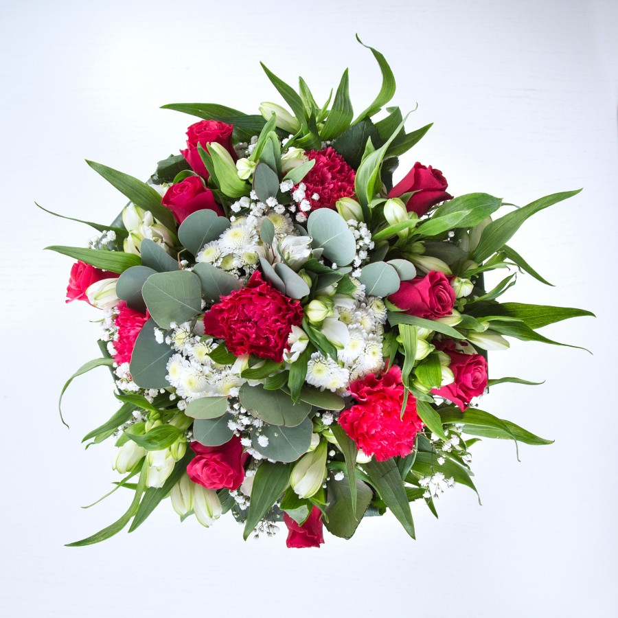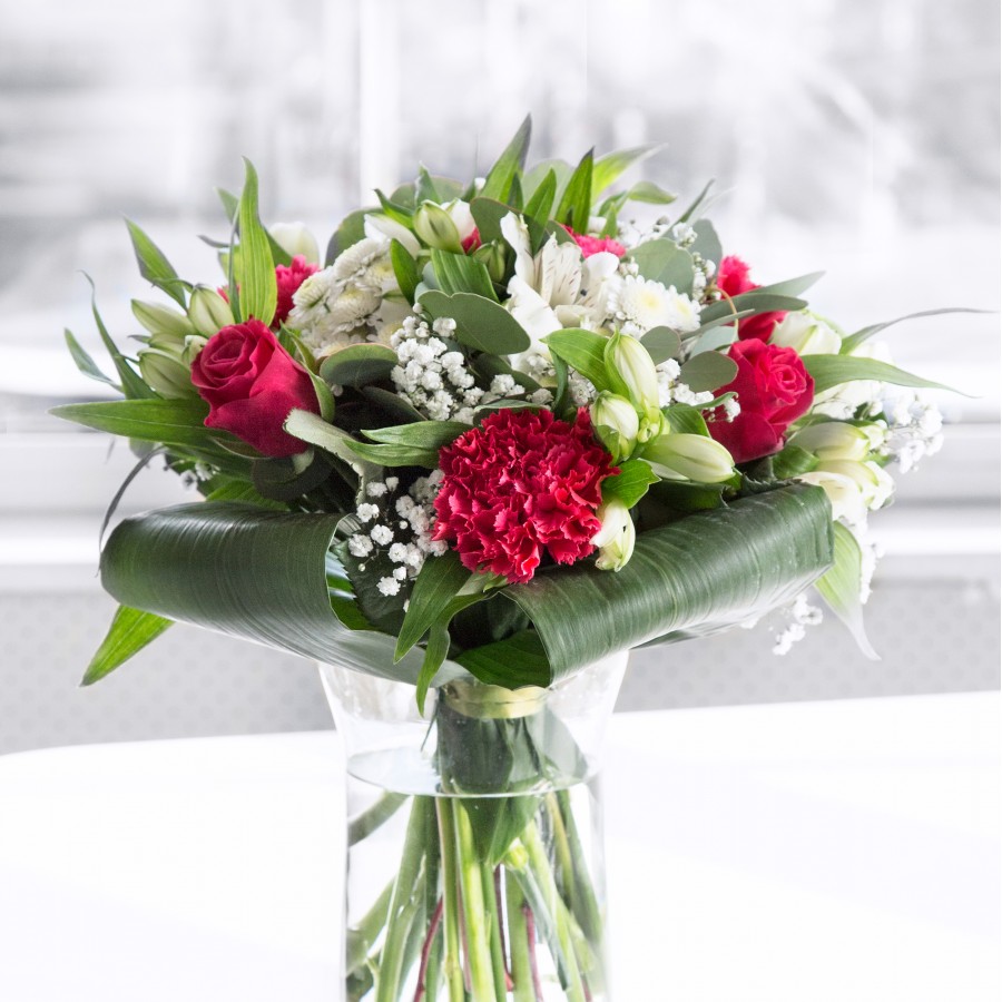 Discover pure elegance with our Pure Elegance Flower Arrangement. This sophisticated bouquet features deep red roses and lovely carnations, artfully combined with immaculate white chrysanthemums and soft gypsophila. Accented by white alstroemeria and lush aspidistra leaves, each flower is hand-selected to ensure utmost freshness and exceptional quality.