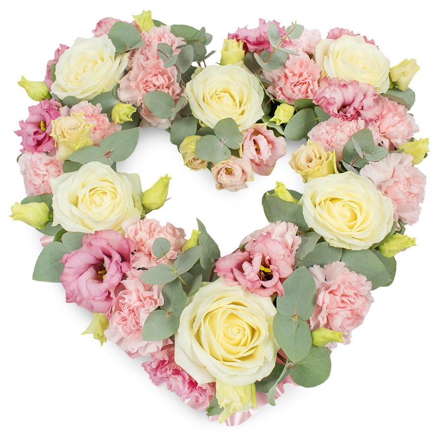 Convey your deepest sympathies with our refined open heart sympathy arrangement. This elegant bouquet features a delicate combination of white roses, pink carnations, pink lisianthus, and eucalyptus leaves, artfully arranged to honor and remember your loved ones.